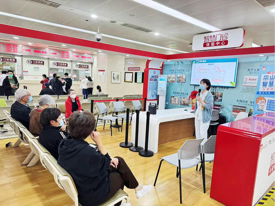 在推進(jìn)新技術(shù)應(yīng)用的同時(shí),華山醫(yī)院考慮到目前還不能熟練使用智能設(shè)備的老年患者,開設(shè)智慧門診長者中心,教老人學(xué)習(xí)“掌上就醫(yī)”